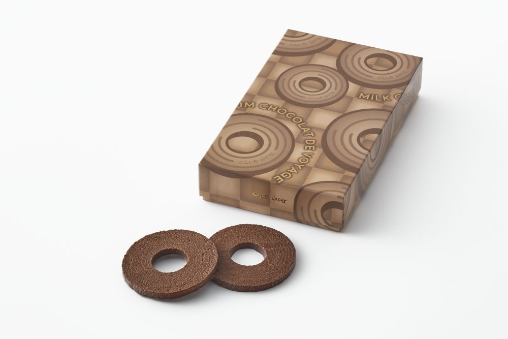バームショコラ ド ヴォヤージュはクラブハリエのバームクーヘンとチョコレートを組み合わせた焼き菓子です。専用のレシピで焼きあげたバームクーヘンを熱風で乾燥させ、4種類のチョコレートをブレンドしたショコラを染み込ませています。