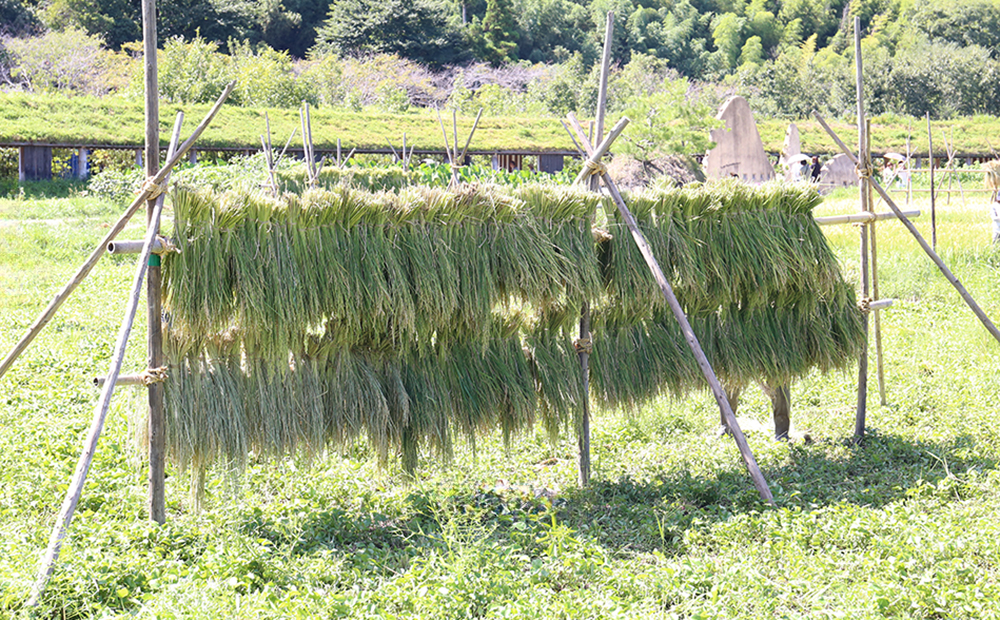 鎌を使って手作業で稲を刈り、刈った稲を稲架(はさ)がけします。