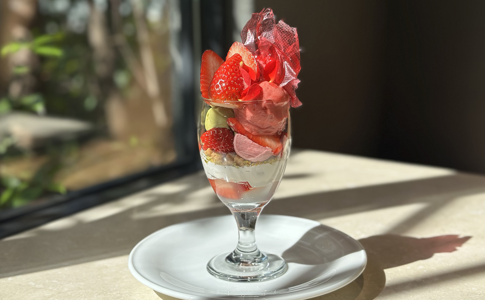 地元の契約農家「いちこ いちごさん」が手間暇かけて大切に育てた美味しいいちごを使い、甘酸っぱい苺ジェラートと濃厚なピスタチオジェラートを合わせました。