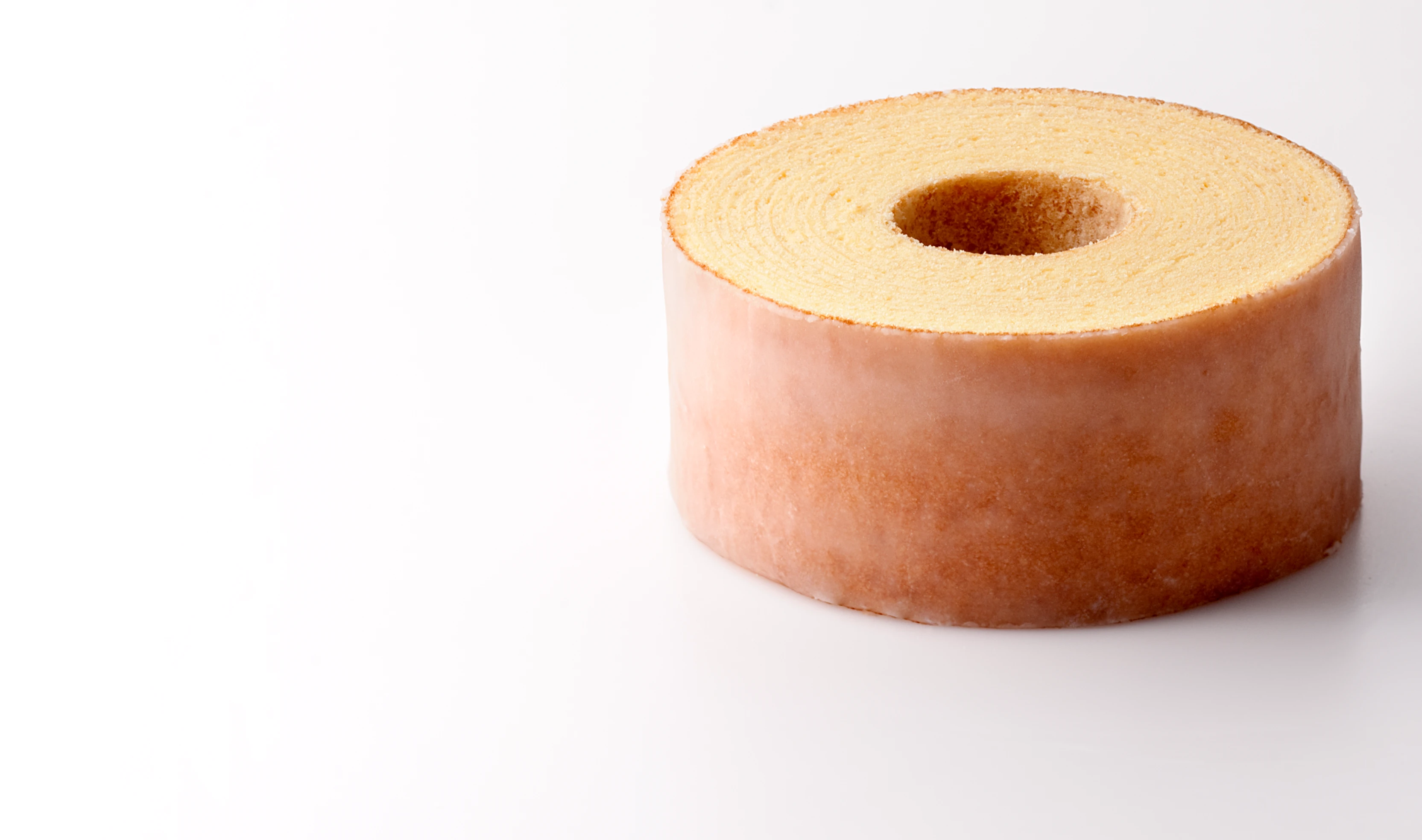 バームクーヘンは芯棒に生地をつけ、回しながら焼きます。焼成後に芯棒を抜くことで穴ができます。