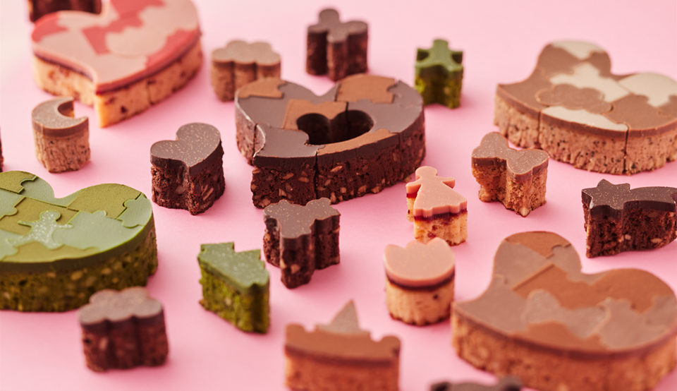 ハート型のパズルで遊び心はそのまま、生地やガナッシュに工夫をかさねた一品です。豊かなカカオ感と口溶け、香り高いナッツの食感をお楽しみいただけます。