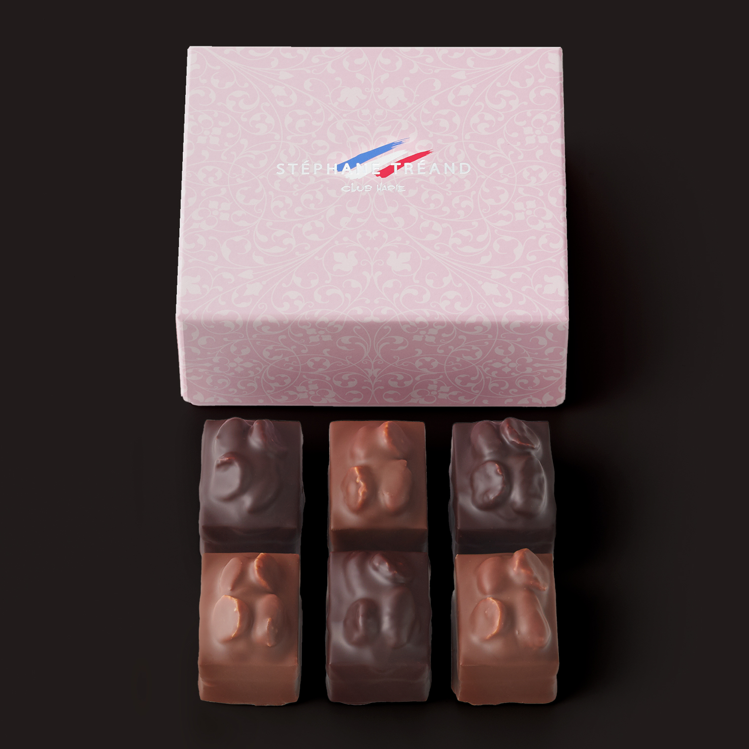 アーモンドたっぷりのヌガーを、スイートチョコレートとミルクチョコレートで仕上げました。パリっとした食感をお楽しみください。