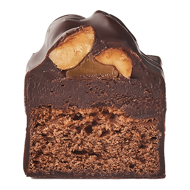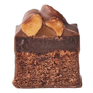 溶かしチョコレート入りの軽い生地、心地よい酸味と苦味があるガナッシュになめらかなキャラメルを絞り、ピーナッツとヘーゼルナッツをのせました。